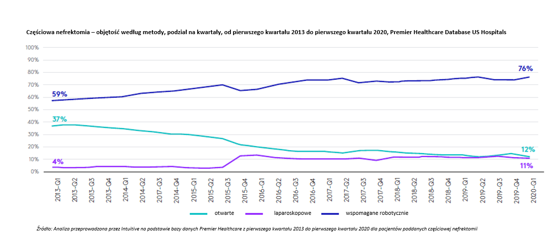 Zastosowanie chirurgii robotycznej w leczeniu raka nerki znacząco wzrosło na przestrzeni lat. Z danych National Cancer Database (NCDB) za lata 2010–2015 wynika, że udział minimalnie inwazyjnych częściowych nefrektomii systematycznie się zwiększa, głównie dzięki rosnącemu wykorzystaniu robotyki. Badania z USA i Niemiec wskazują na wzrost popularności tej metody, przy czym w Niemczech adaptacja przebiega na szerszą skalę. W Stanach Zjednoczonych, według Premier Healthcare Database, w 2020 roku 76% wszystkich częściowych nefrektomii było wykonywanych robotycznie, co stanowi wzrost o 16% w porównaniu do roku 2013.